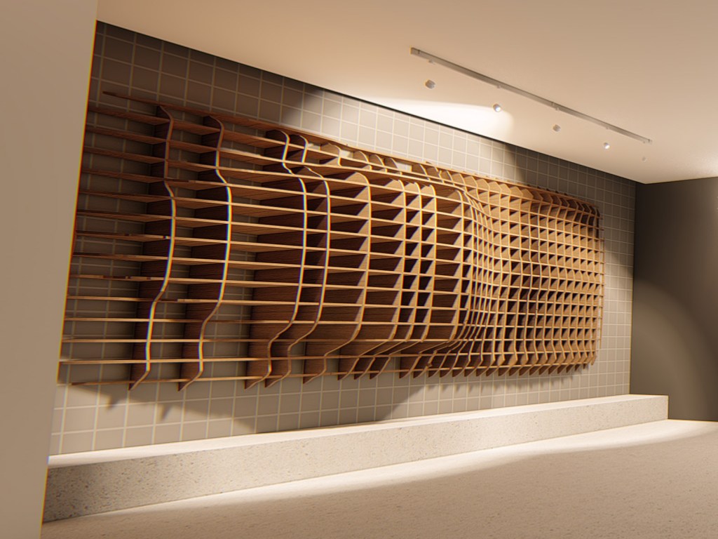 Working with dPop and the client, I developed focal graphics for a new connecting bridge at the Tech Center in Warren, MI. The concept arose from the way metal was formed, back in the day, to mock up car body panels. The process used Buck Forms, cut out of wood. The forms allowed for more organic forms.